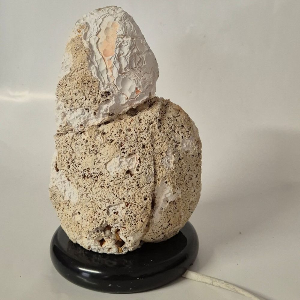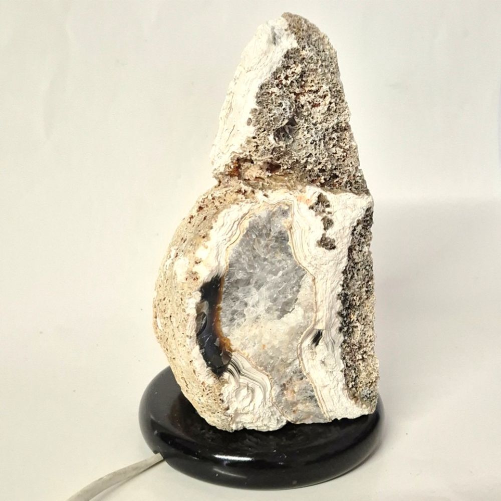 Dekorative Naturstein Lampe mit einer besonders interessanten Maserung, teilpolierte Vorderfront, rundum Natur belassen. Geliefert wird die Lampe mit einem dunklen Sockel aus Onyx Marmor. Das dekorative Licht dieser Edelsteinlampen können als Orientierungshilfe oder einfach zum Entspannen wunderbar aufgestellt werden und sind auch am Tag ein dekorativer Blickfang.