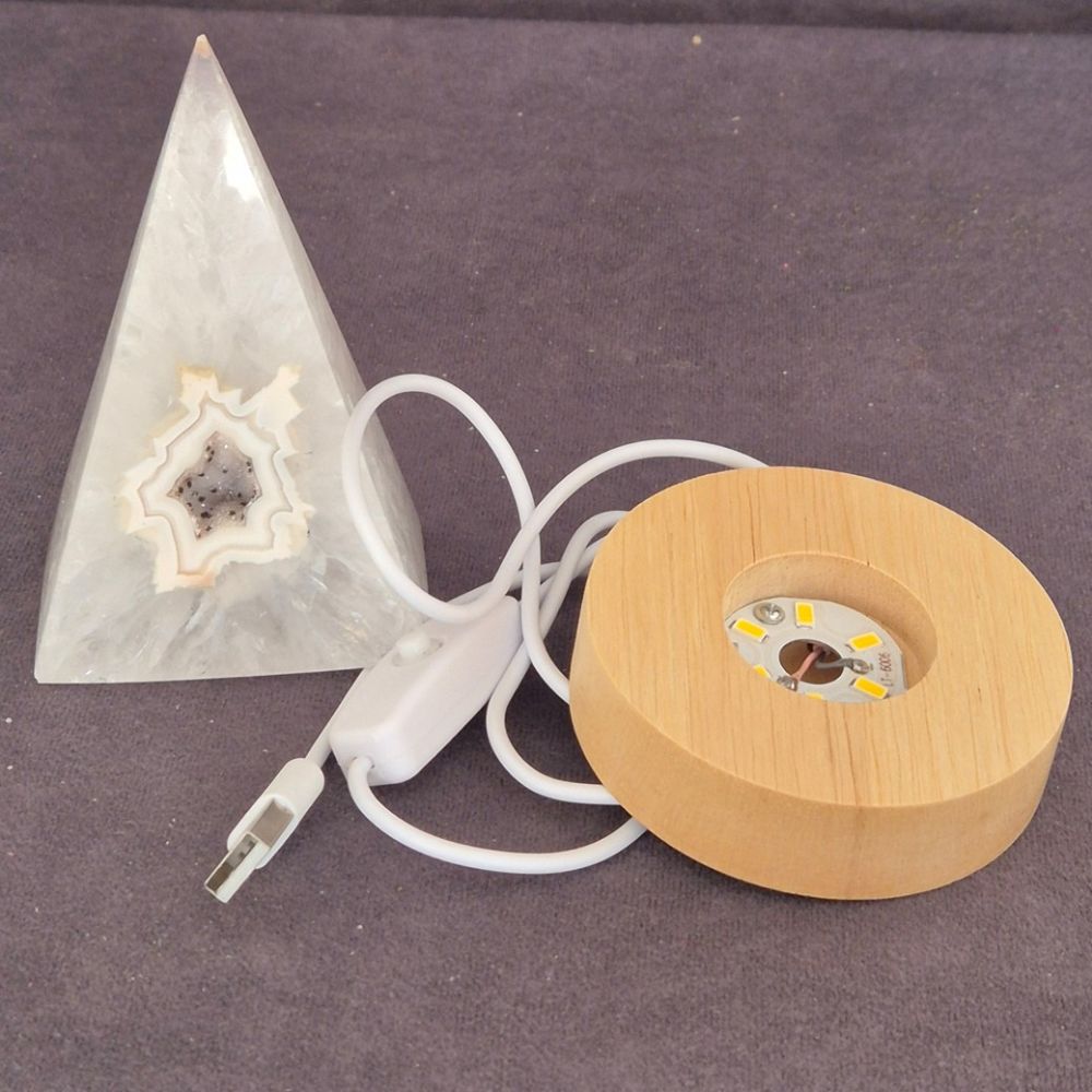 Lieferumfang: 1 Achat-Spitze, Obelisk Größe: ca. 11 x 6,5 x 4,5 cm / Gesamthöhe mit Sockel ca. 13 cm / ca.300g schwer 1 LED-Holzsockel, rund ca. 8 cm Durchmesser, USB-Anschluss, weißes Kabel mit Zwischenschalter Sie erhalten den Achat vom Foto.Sicherheitshinweise Edelstein Kristall-Stein-Lampe
