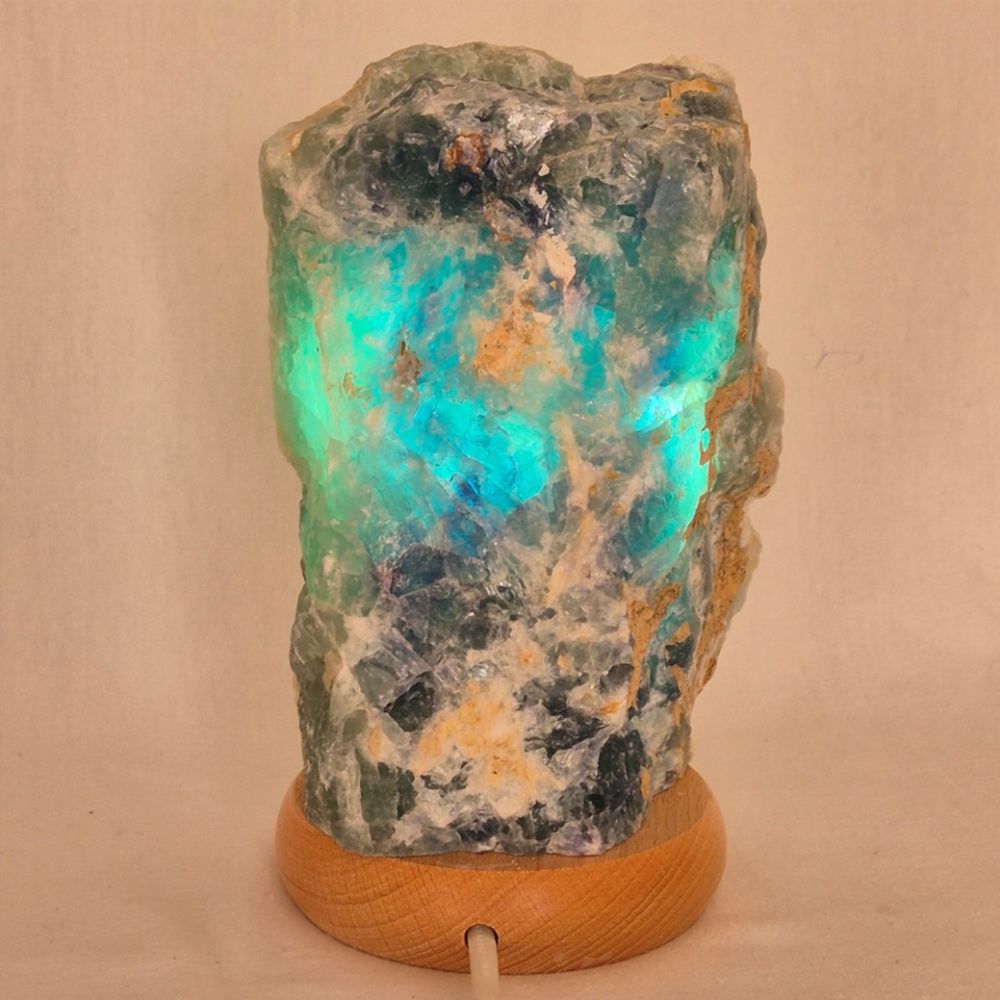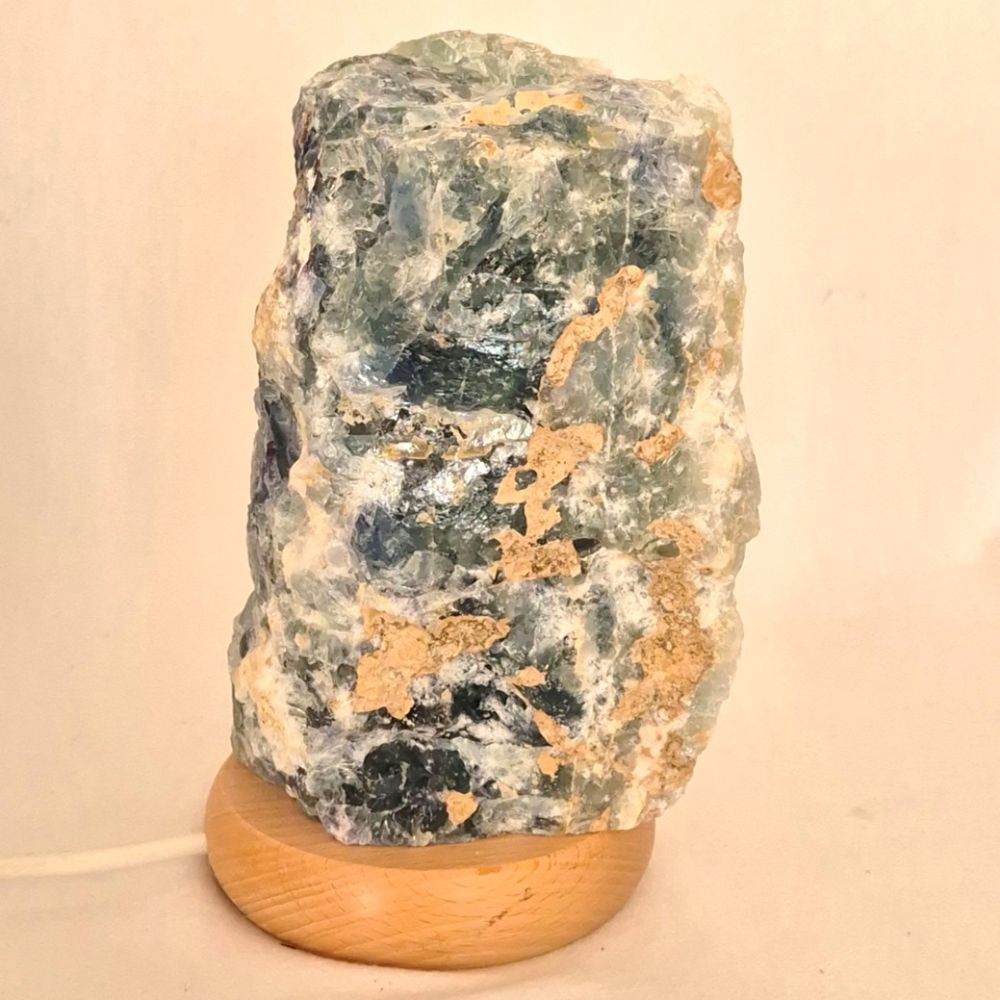 Material: Fluorit, grün Beschaffenheit: Front gesägt-poliert, Rück- und Seitenflächen roh Natur belassen Lieferung: das Original vom Foto Lampe mit hellem Holzsockel, ca. 10 cm Durchmesser, weißes Kalbel mit Schalter, Fassung E14 1 LED-Leuchtmittel-Kaltlicht ( Fluorit leuchtet besser mit Kaltlicht) Größe: H/B/T ca. 18,5 x 11x 8 cmSicherheitshinweise Edelstein Kristall-Stein-Lampe