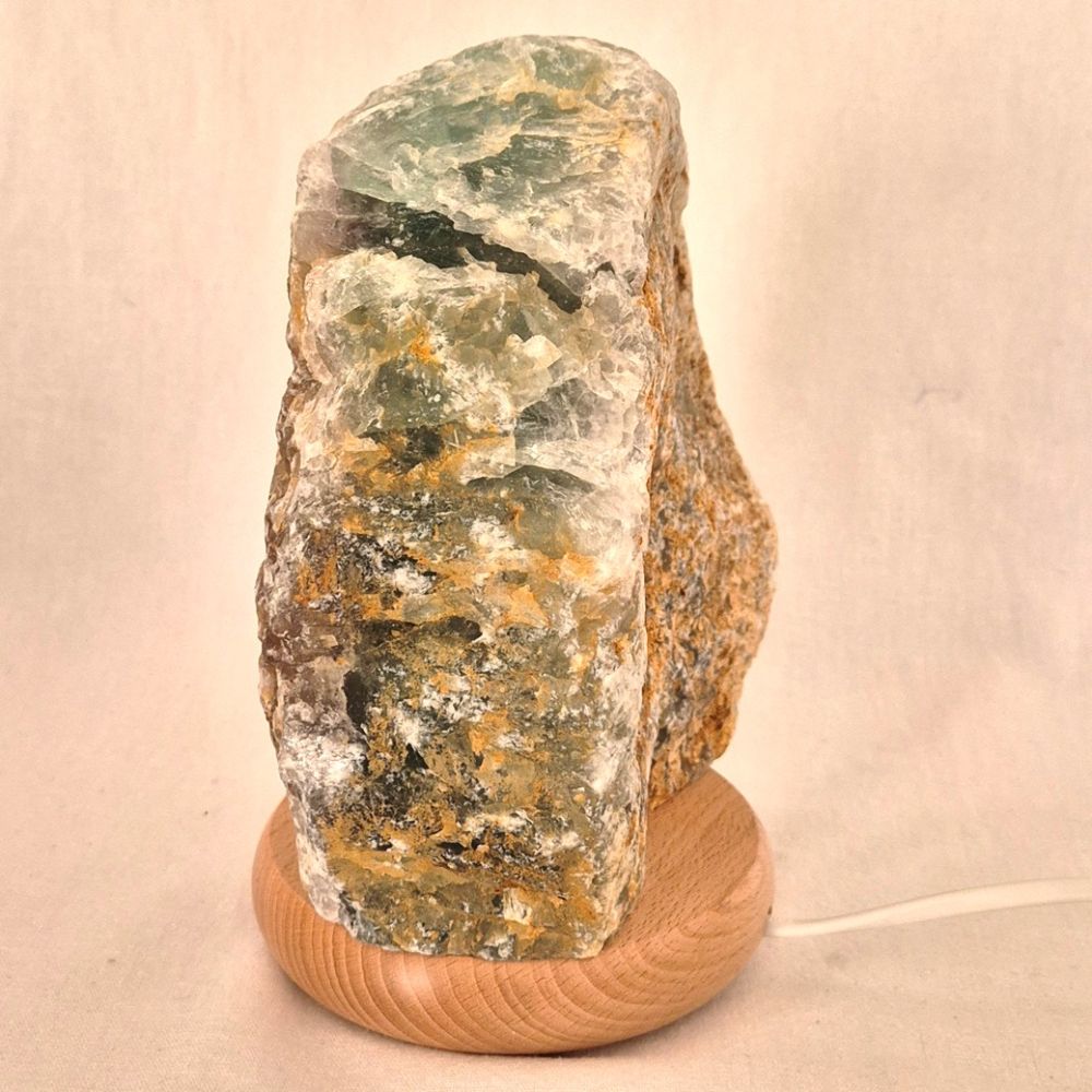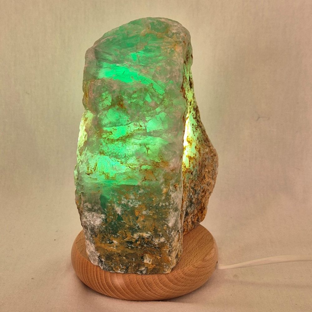 Material: Fluorit, grün Beschaffenheit: Rohstein Hand geklopft, urige Form, Natur belassen Lieferung: das Original vom Foto Lampe mit hellem Holzsockel, ca. 12 cm Durchmesser, weißes Kalbel mit Schalter, Fassung E14 1 LED-Leuchtmittel-Kaltlicht ( Fluorit leuchtet besser mit Kaltlicht) Größe: H/B/T ca. 20,5 x 13 x 9 cmSicherheitshinweise Edelstein Kristall-Stein-Lampe