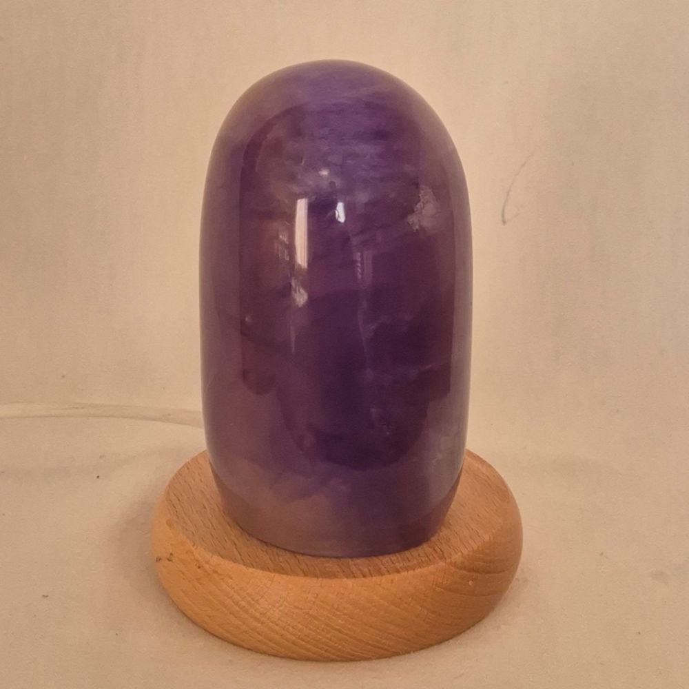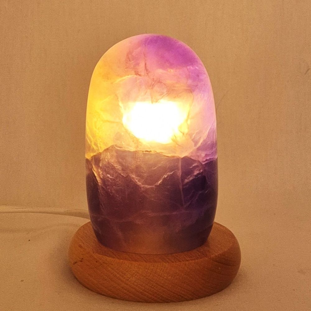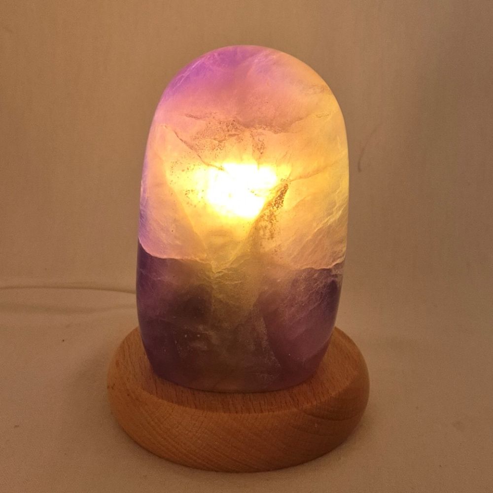 Material: Fluorit, violett Beschaffenheit: voll poliert, edel glänzend polierter Fluoritstein Lieferung: das Original vom Foto Lampe mit hellem Holzsockel, ca. 10 cm Durchmesser, weißes Kalbel mit Schalter, Fassung E14 1 LED-Leuchtmittel-Warmlicht Größe: H/B/T ca. 14 x 7 x 6 cmSicherheitshinweise Edelstein Kristall-Stein-Lampe