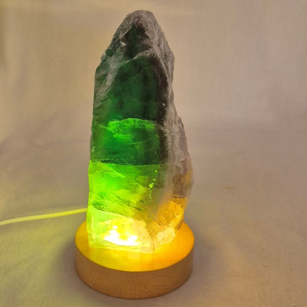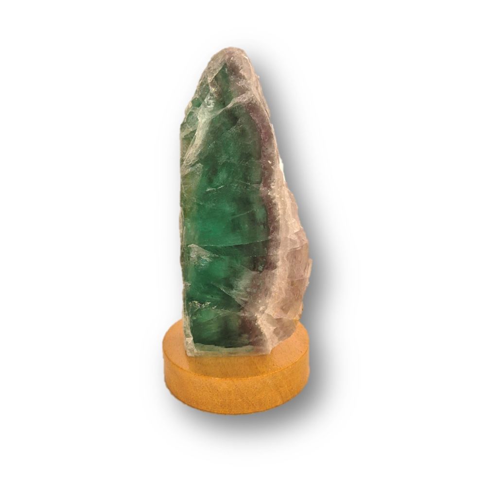 Fluorit grün, roh beleuchtet auf LED Sockel aus Holz- Natur belassener Rohstein die mit dem LED Sockel beleuchtet werden. Beides, der Edelstein Fluorit und der LED-Sockel, können auch einzeln gestellt oder verwendet werden. Es wird nichts geschraubt, wir haben hier eine einfache Handhabung. Das zu beleuchtene Objekt wird einfach auf den Sockel gestellt/gelegt. Der Grüne Fluorit ist Front poliert sonst rundum roh urige Form mit natürlichen Bruchkanten und hat eine gesägte Standfläche.