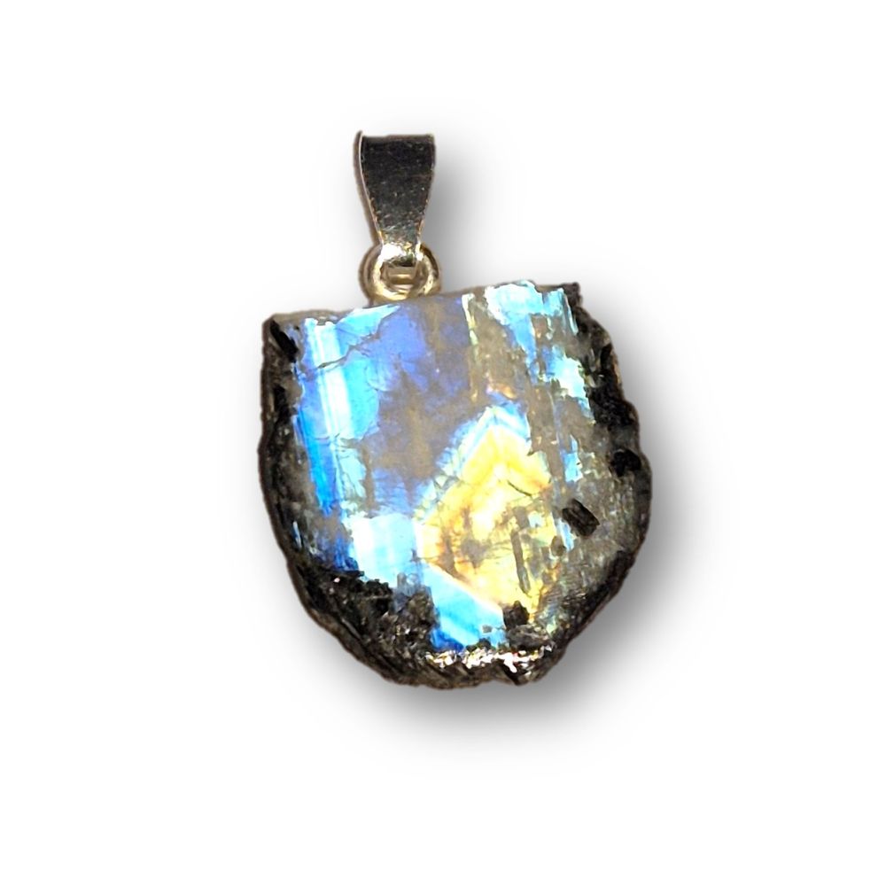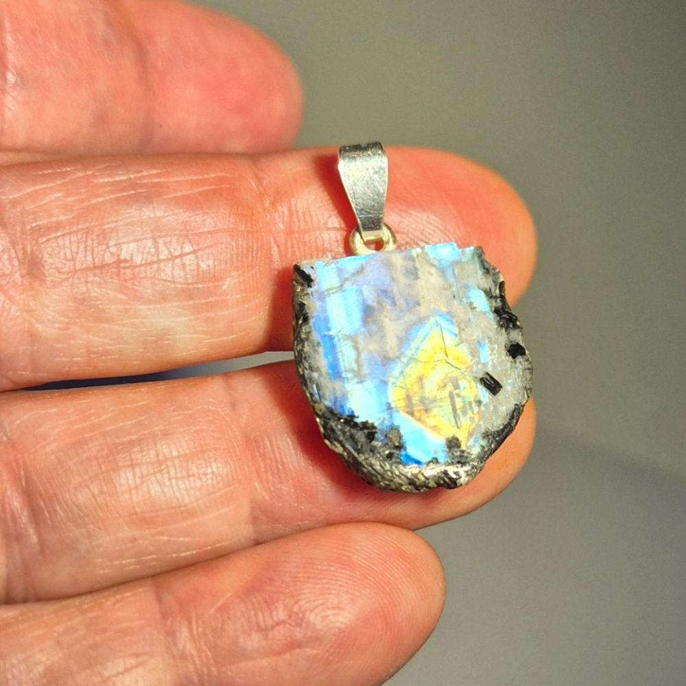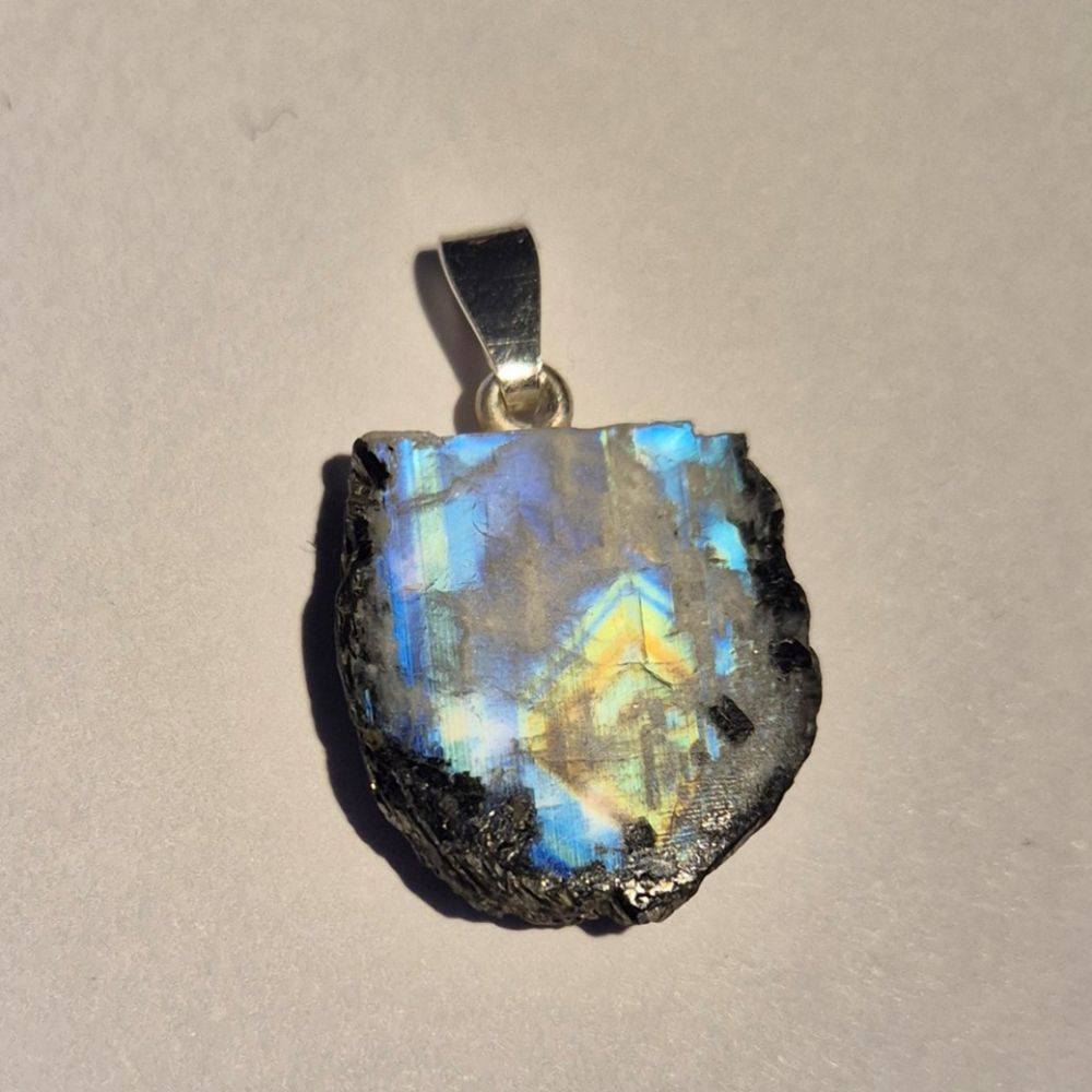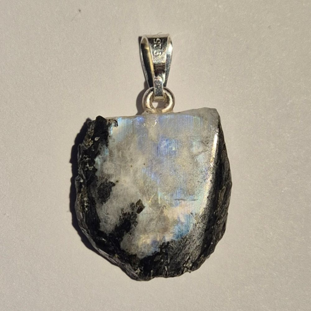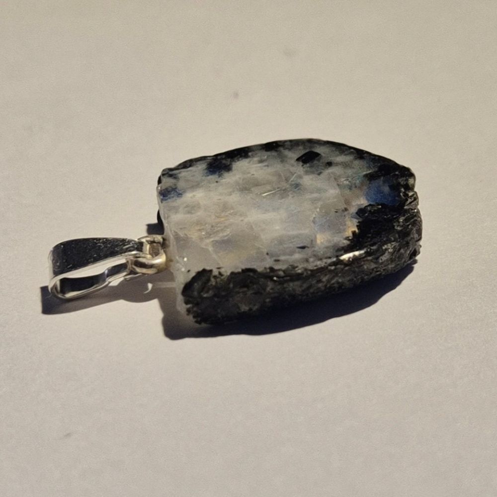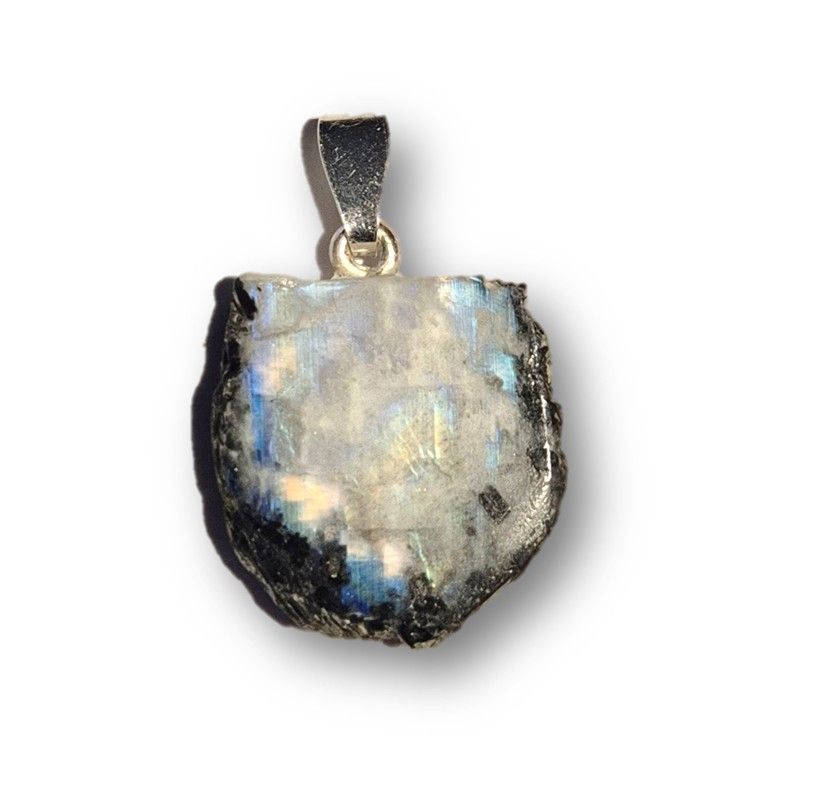 Wunderschöner Regenbogen-Mondstein Anhänger in natürlicher, unregelmäßiger Scheibenform. Der weiß schimmernde Mondstein zeigt bei Bewegung und Lichteinfall einen faszinierenden blauen Schimmer (Adulareszenz), der jedes Schmuckstück zu einem einzigartigen Blickfang macht.