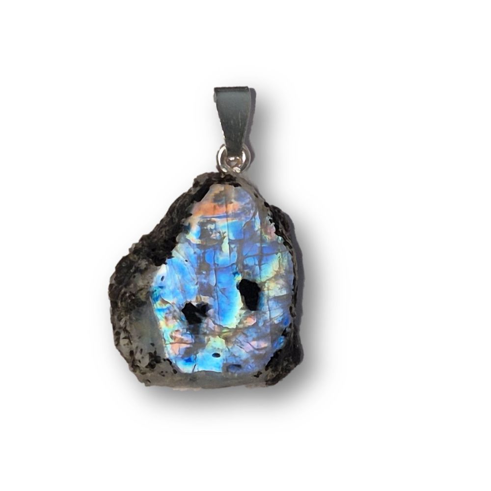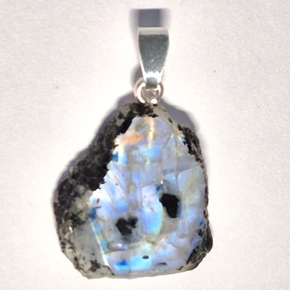 Dieser Regenbogen-Mondstein Edelstein Kettenanhänger wird Ihnen eine sportlich-elegante Ausstrahlung verleihen. Die glänzend polierte Oberfläche und die Natur belassensen rohen Seitenflächen bilden einen fantastischen Kontrast zum sanften Schimmer des Mondsteins und unterstreicht seine mystische Ausstrahlung. Die Kombination aus Rohstein und polierten Flächen unterstreichen die natürliche Schönheit dieses Edelsteins, der hier unbehandelt und echt ist.