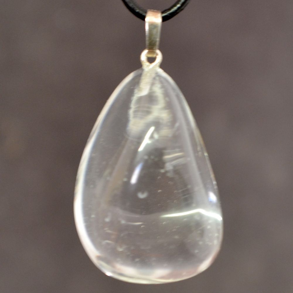 Sie bekommen einen schönen fast klaren-transparenten Bergkristall Trommelstein Schmuck-Anhänger. Dieser ist zeitlos und lässt sich wunderbar zu jedem Kleidungsstil kombinieren.