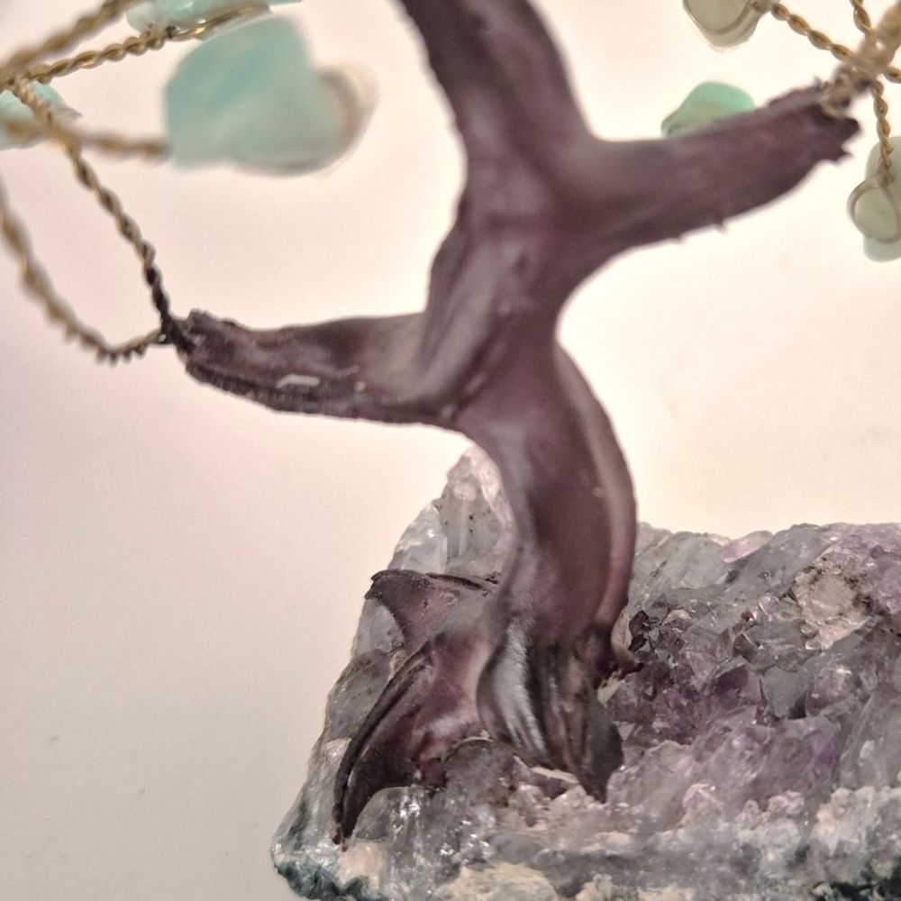 Edelsteinbaum auf Amethyst Druse - Amaznit Blätter und Naturgetreuer Stamm aus Kunstharz und Draht. Dieser kunstvoll gefertigte Edelsteinbaum vereint natürliche Schönheit mit detailreicher Handwerkskunst. Die Basis bildet ein echtes Amethyst-Drusenstück, das nicht nur als stabiler Standfuß dient, sondern auch mit der violetten Kristallstruktur ein echter Blickfang ist.