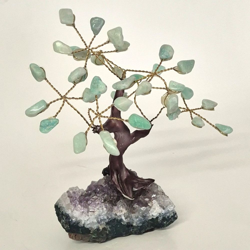 Die Blätter bestehen aus sorgfältig ausgewählten, getrommelten Amazonit Steinchen, die grün-weiss leuchten und dem Baum eine harmoische, herzliche Ausstrahlung verleihen.