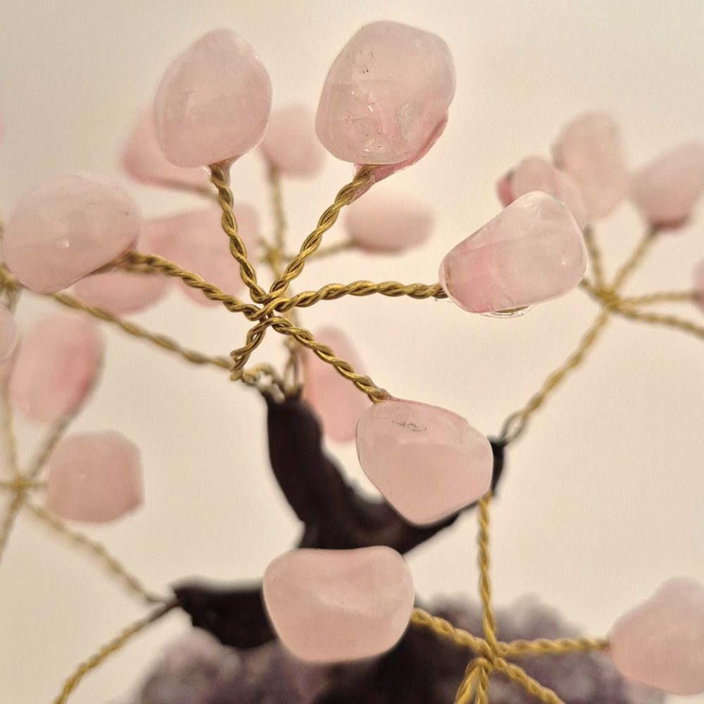 Die Blätter bestehen aus sorgfältig ausgewählten, getrommelten Rosenquarz Steinchen, die zart rosea leuchten und dem Baum eine harmoische, herzliche Ausstrahlung verleihen.