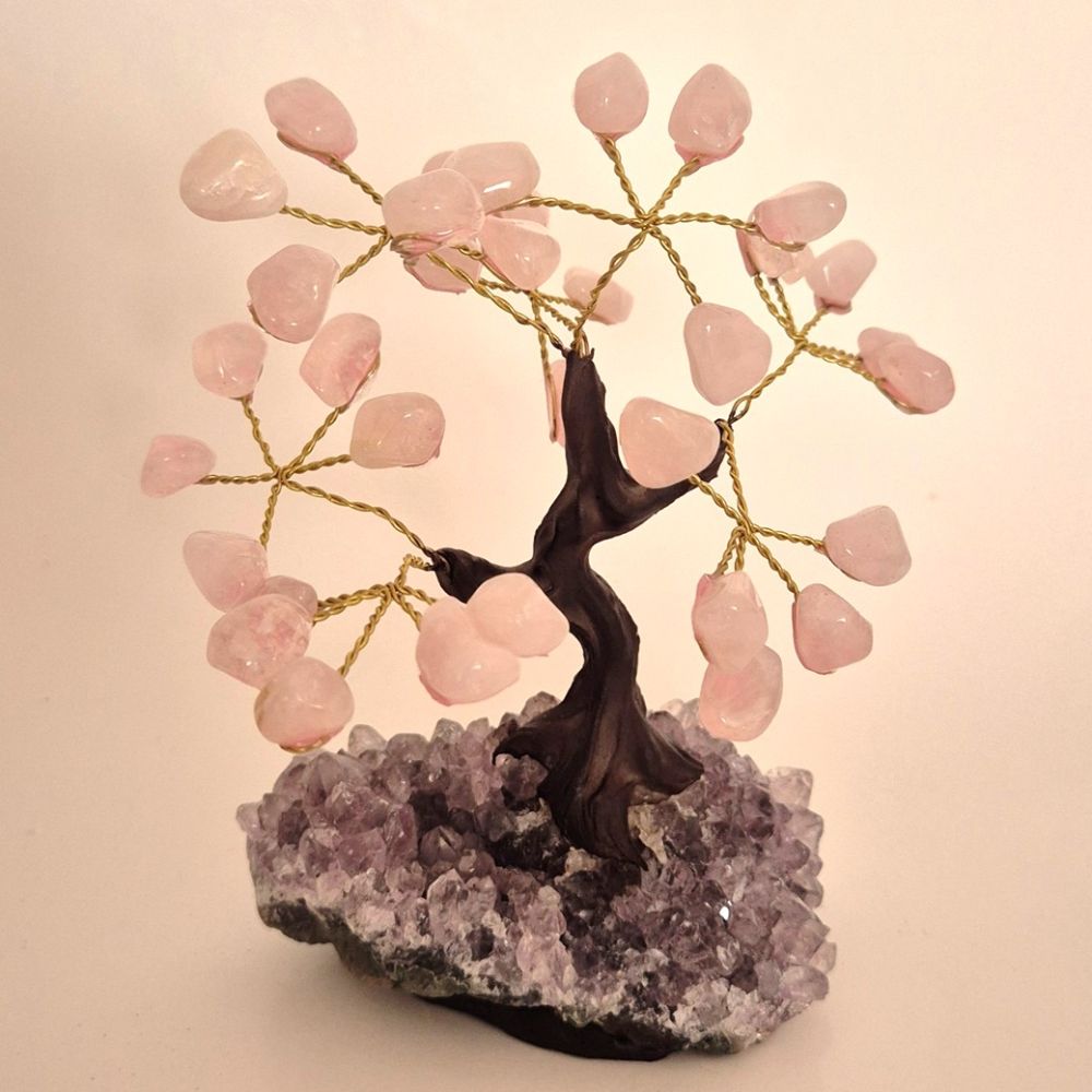 Edelsteinbaum auf Amethyst Druse - Rosenquarz Blätter und Naturgetreuer Stamm aus Kunstharz und Draht. Dieser kunstvoll gefertigte Edelsteinbaum vereint natürliche Schönheit mit detailreicher Handwerkskunst. Die Basis bildet ein echtes Amethyst-Drusenstück, das nicht nur als stabiler Standfuß dient, sondern auch mit der violetten Kristallstruktur ein echter Blickfang ist.