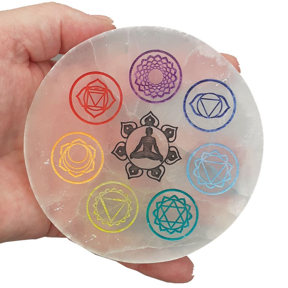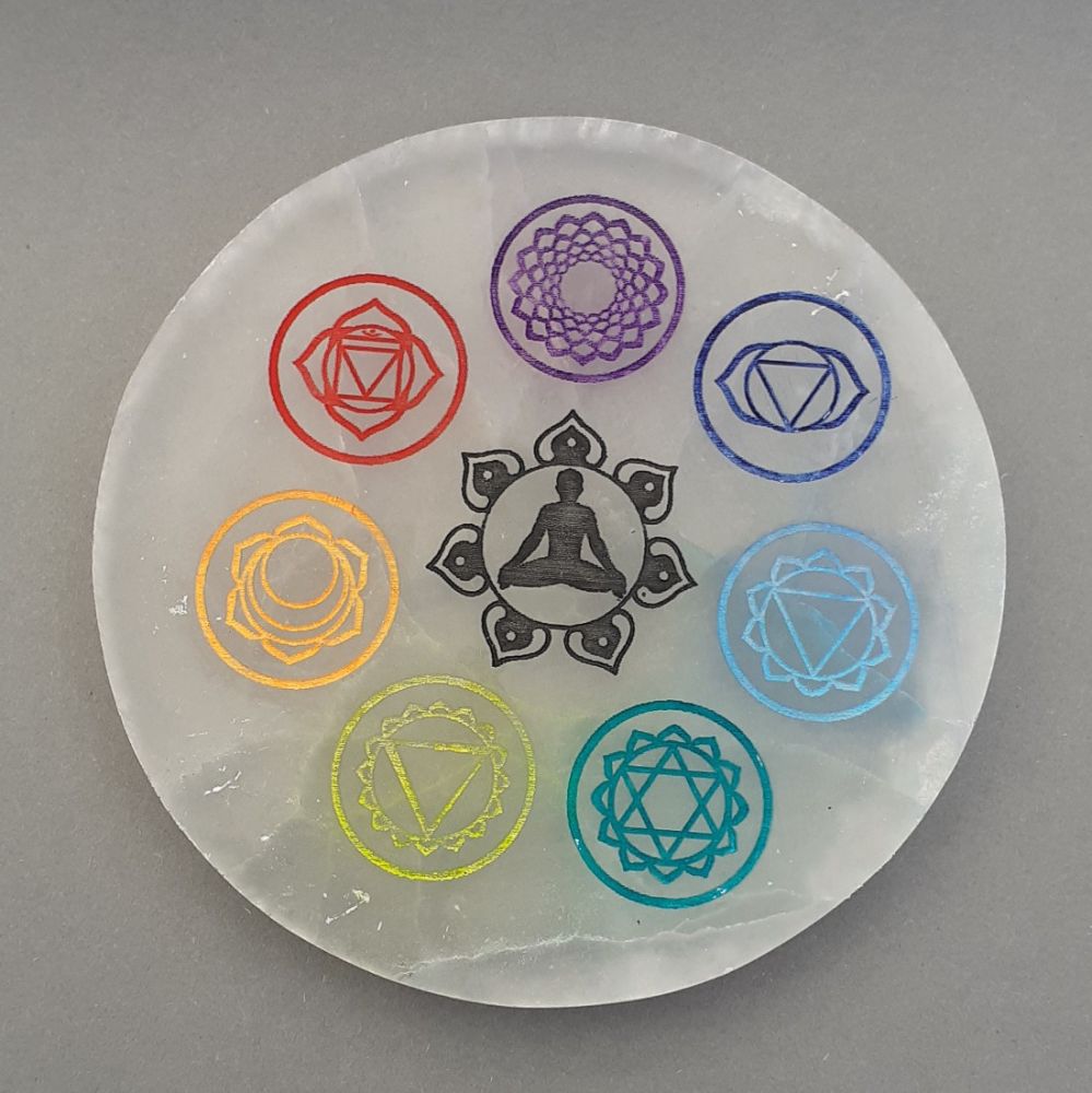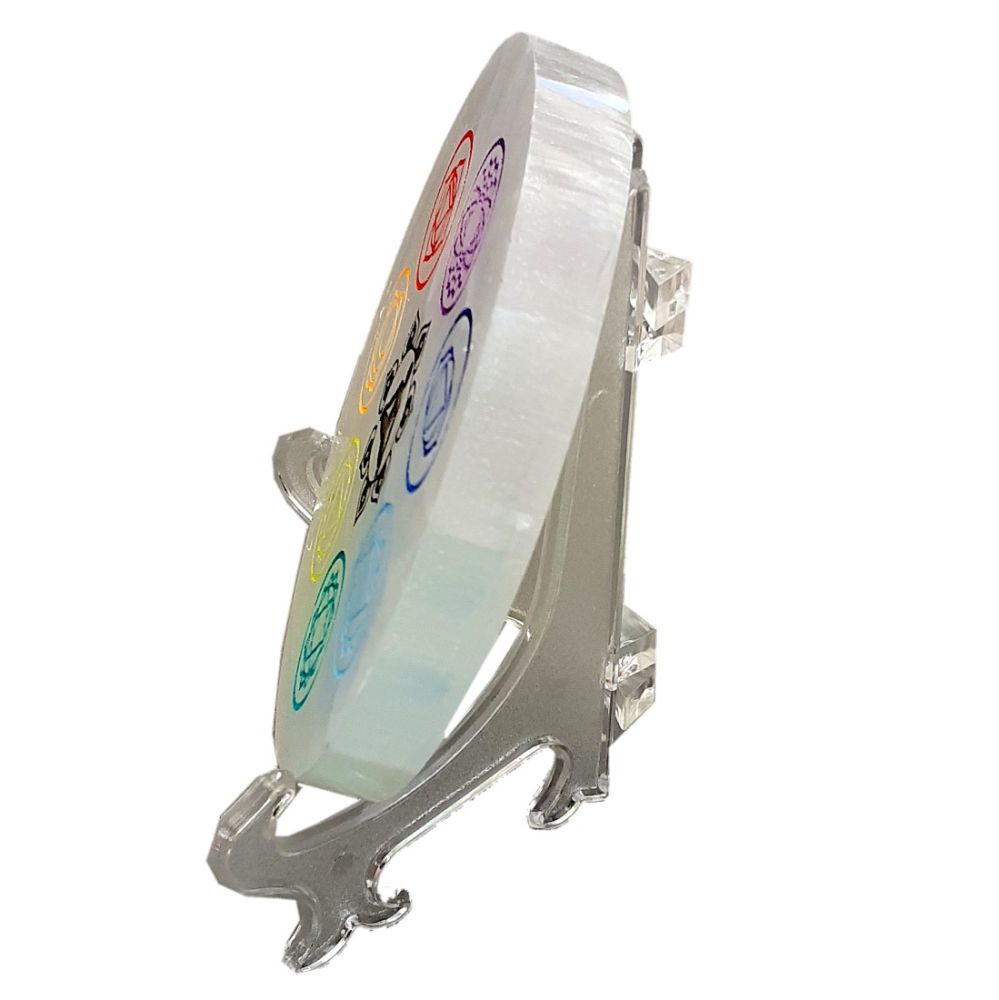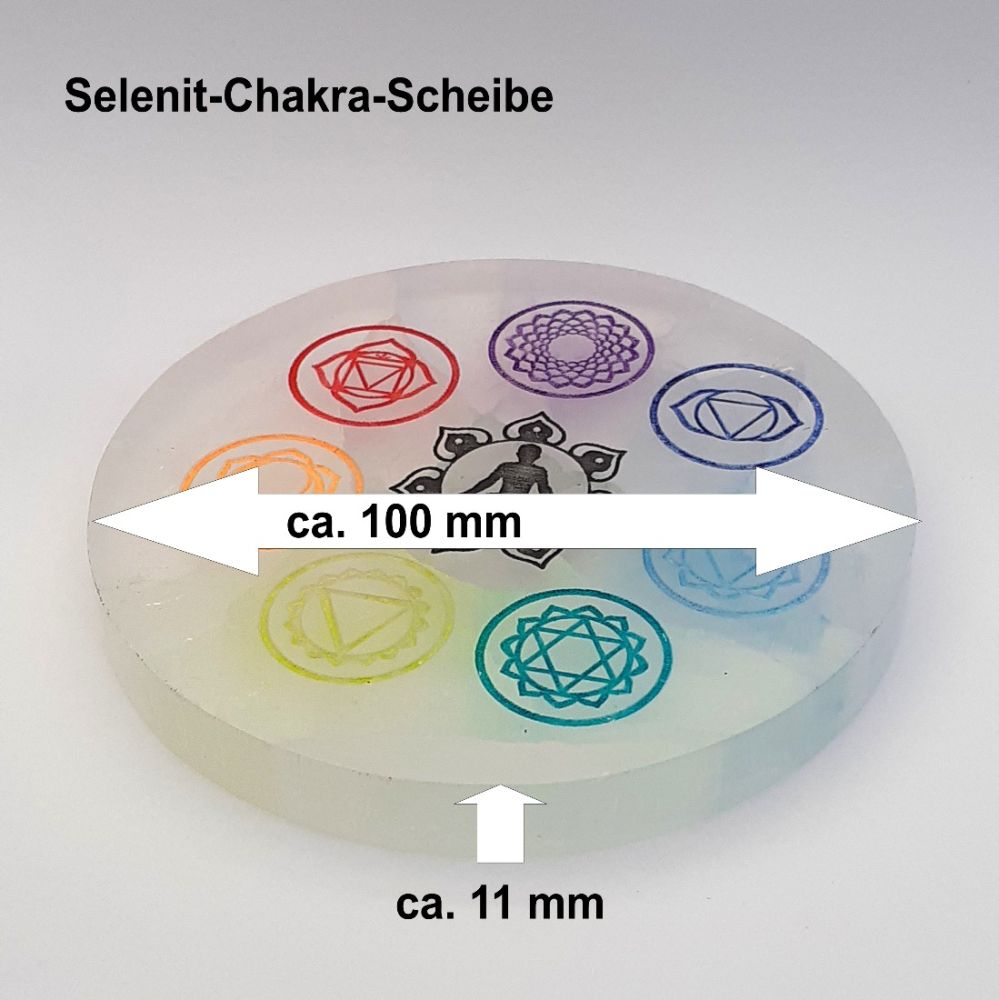 1 Selenit Symbol Scheibe mit Chakra Markierungen
