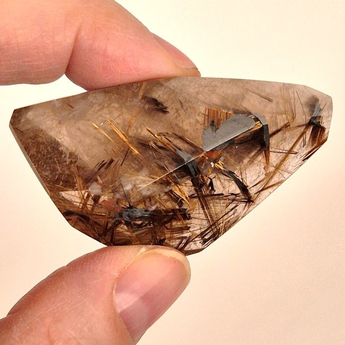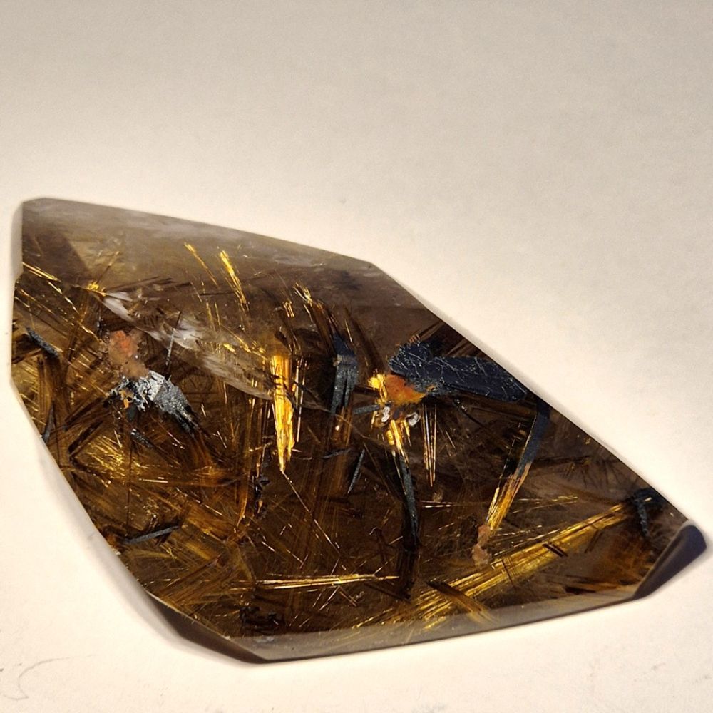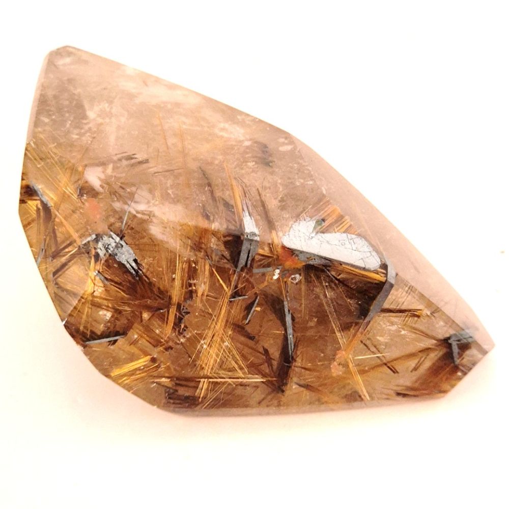 Dieser außergewöhnliche Rutilquarz stammt direkt aus Brasilien und zeigt wunderschöne, leuchtend goldene Rutilnadeln sowie seltene Hämatit-Einschlüsse. Die polierte Freeform offenbart die faszinierende Struktur und Tiefe dieses natürlichen Kristalls – jedes Stück ist ein Unikat.