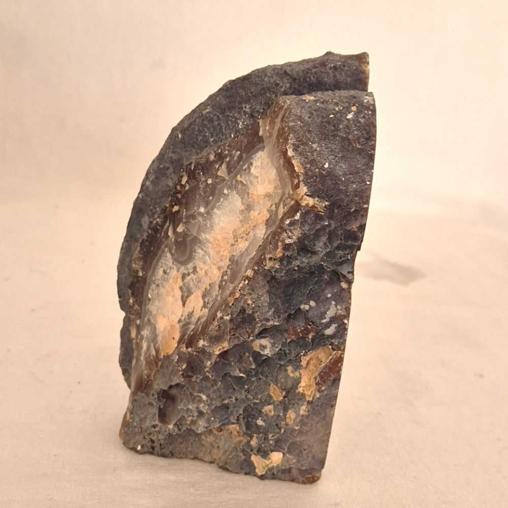 Die Achatgeode hat eine gesägte Standfläche und die Vorderfront ist poliert, die Seiten sind Natur belassen. Wir haben hier eine schönes Dekorations-Standobjekt, dekorativ und einzigartig.