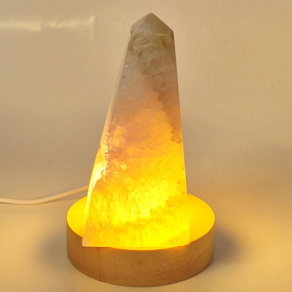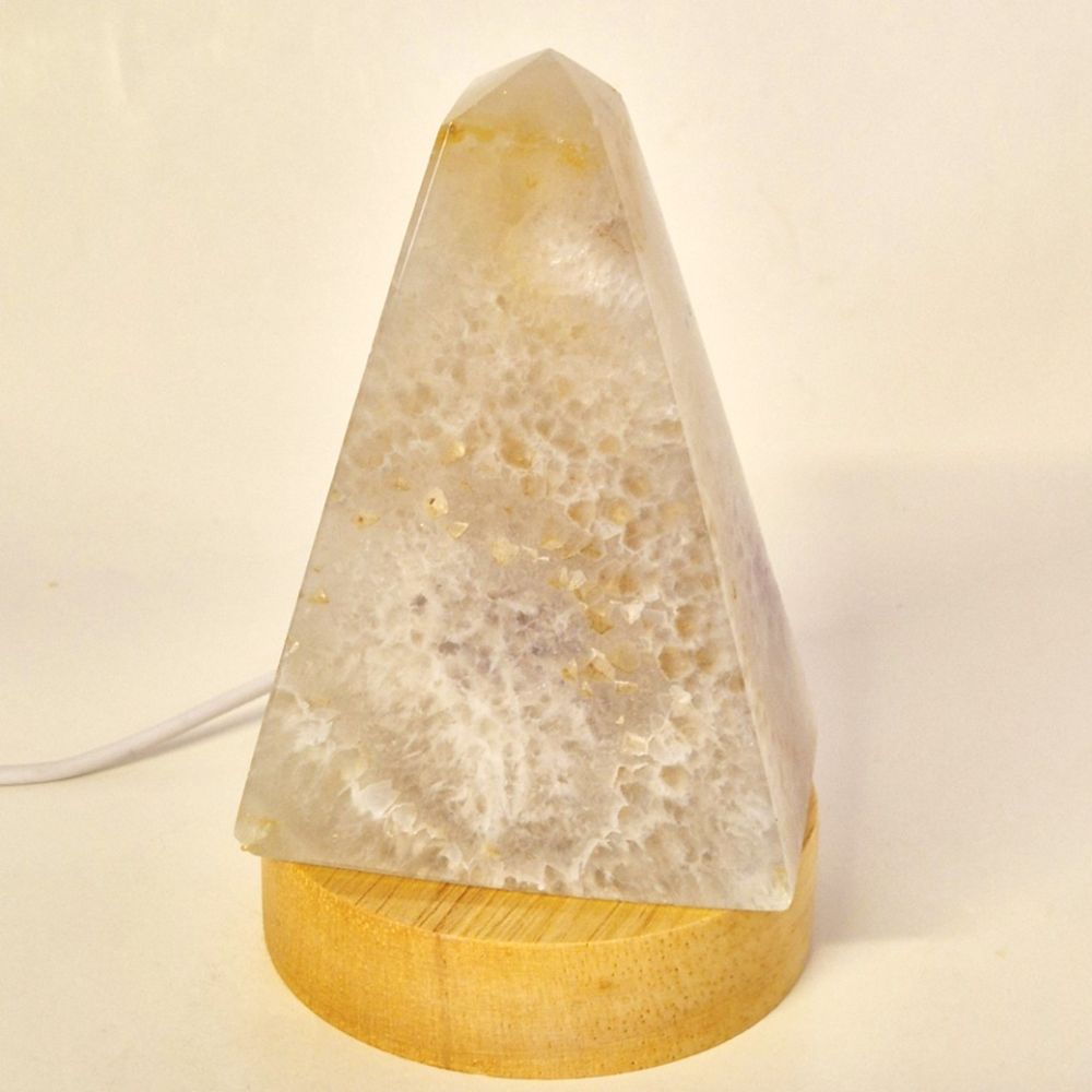 Wunderschöner Achat Edelstein Obelisk mit zart lila Amethyst Höhle im Frontbereich – stilvoll beleuchtet auf einem LED-Holzsockel mit warmem Licht. Dieses besondere Einzelstück vereint natürliche Eleganz mit sanfter Beleuchtung und ist ein dekorativer Blickfang für Wohnräume, Meditationsecken oder die Fensterbank.