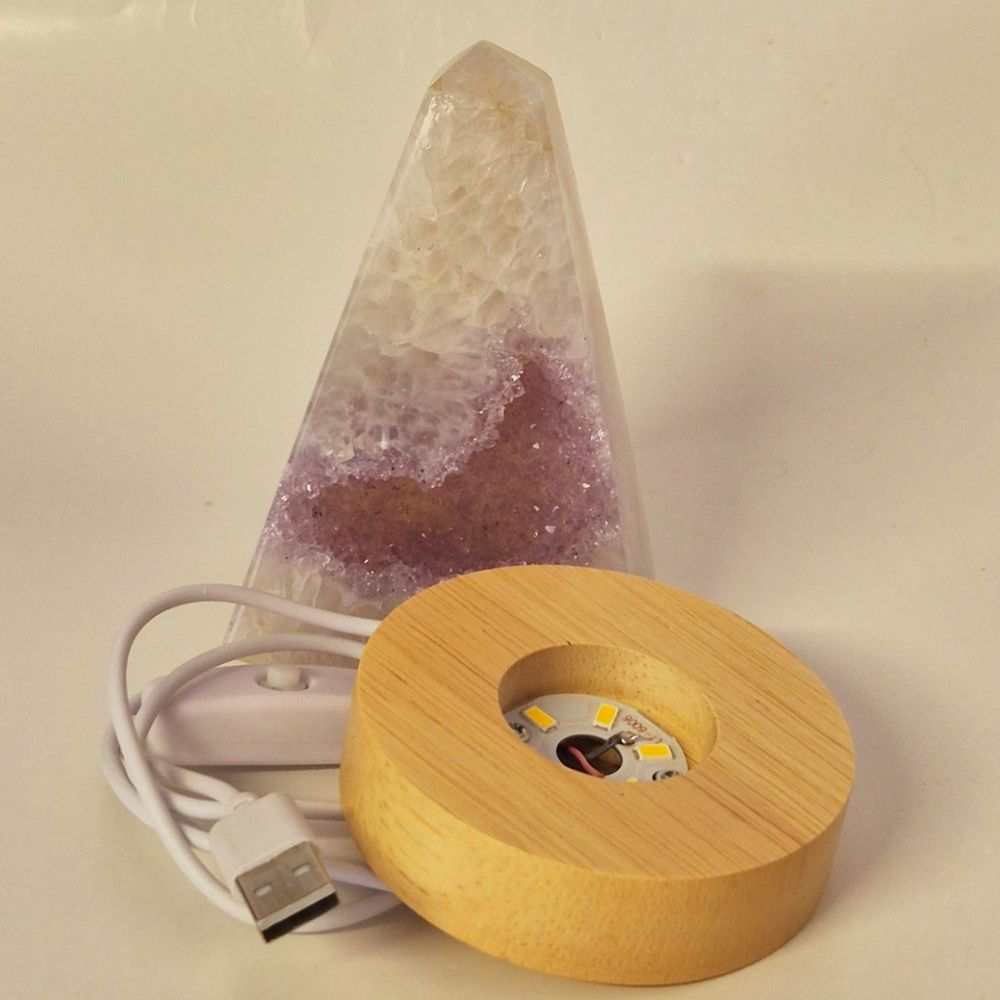 Die Achat Spitze wurde sorgfältig von Hand geschliffen und poliert. Im vorderen Bereich befindet sich eine feine, natürlich gewachsene Amethyst-Druse in zartem Violett, die durch das warme LED-Licht besonders schön zur Geltung kommt.