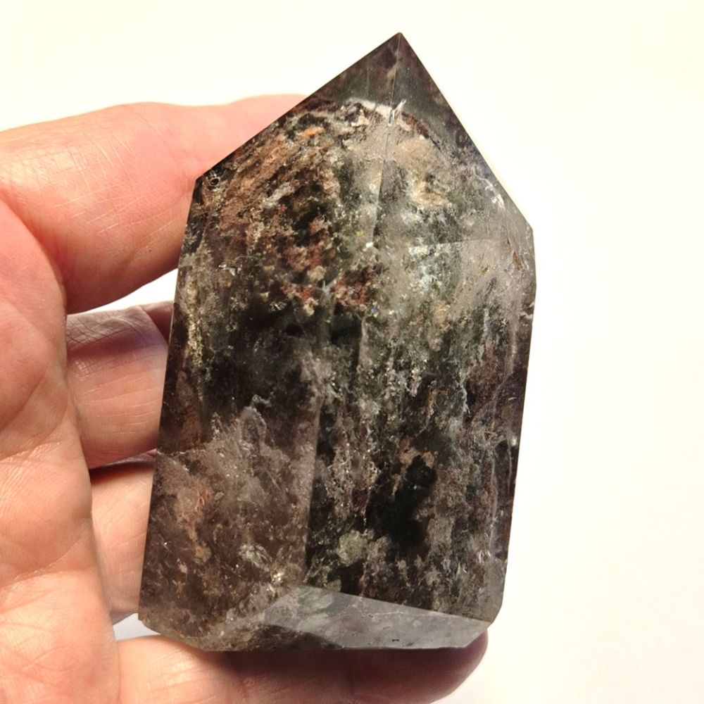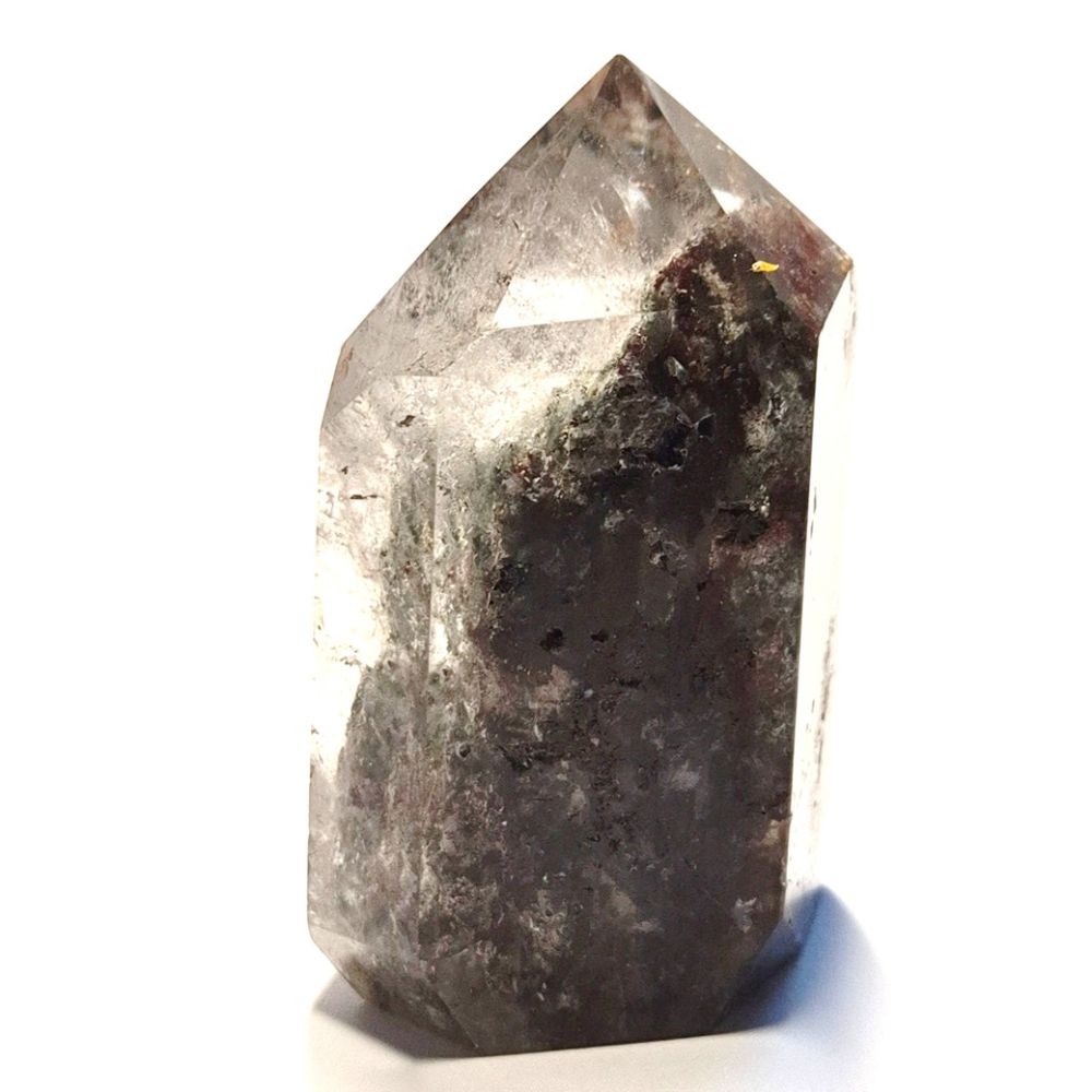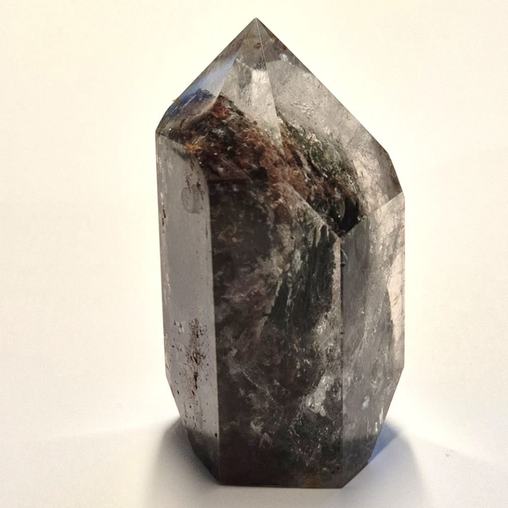 Ein wunderschöner naturgewachsener Garden Quartz / Gartenquarz Turm mit faszinierenden mineralischen Einschlüssen. Jede Seite der Spitze zeigt kleine natürliche „Landschaften“, die durch verschiedene Mineralien im Inneren des Kristalls entstanden sind. Dieser besondere Bergkristall mit Einschlüssen vereint mehrere interessante Strukturen wie:
