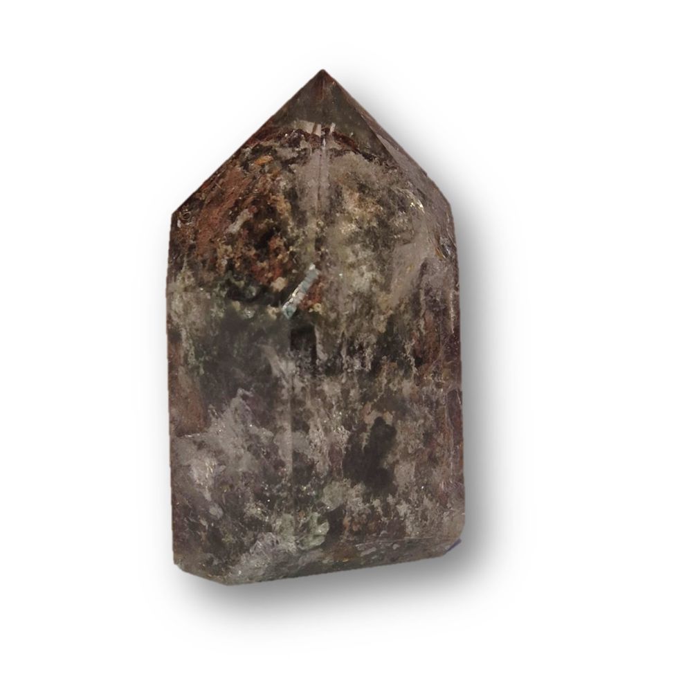 Die Farben im Kristall reichen von weiß, rot, braun, grau bis grün und bilden einzigartige natürliche Muster. Jeder Blickwinkel offenbart neue Details – ein echtes Sammlerstück für Mineralienliebhaber, Kristallsammler oder zur Dekoration.