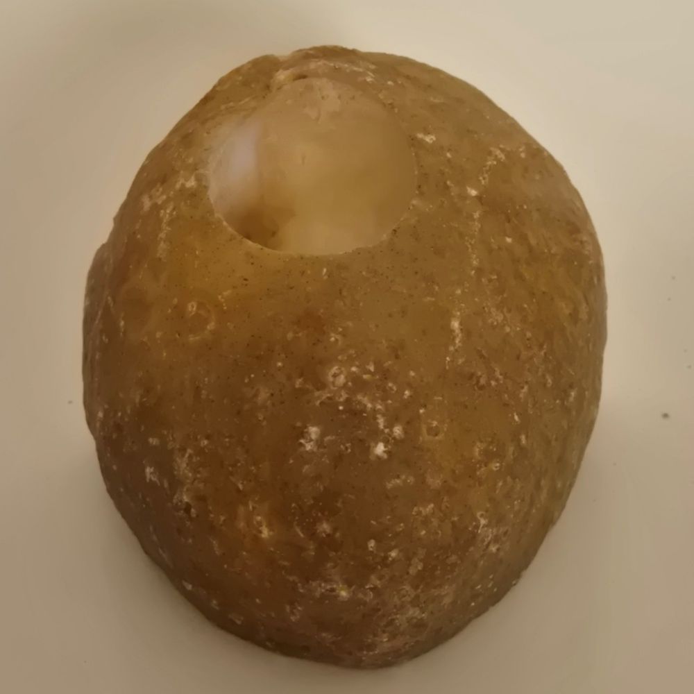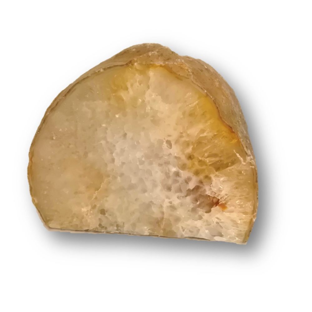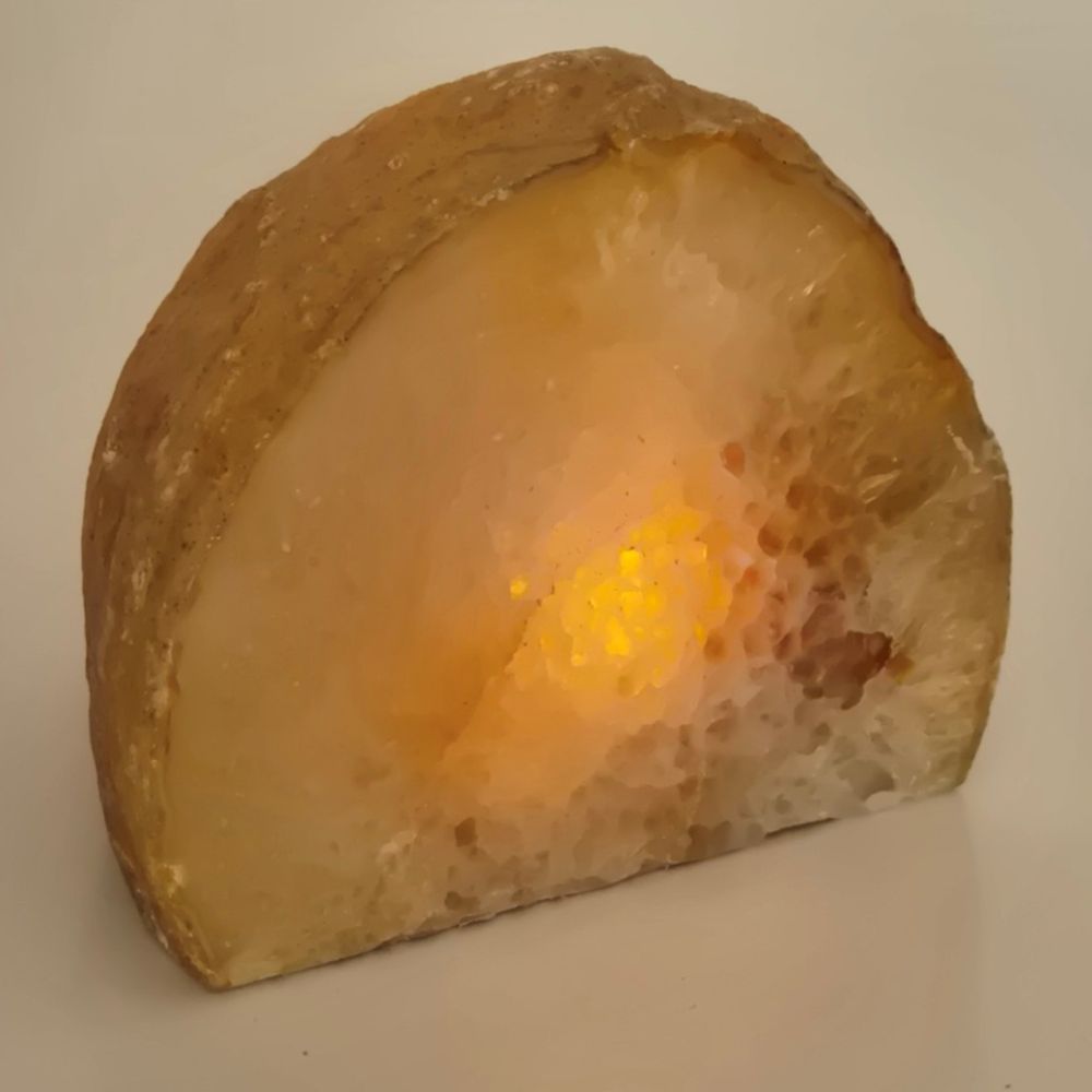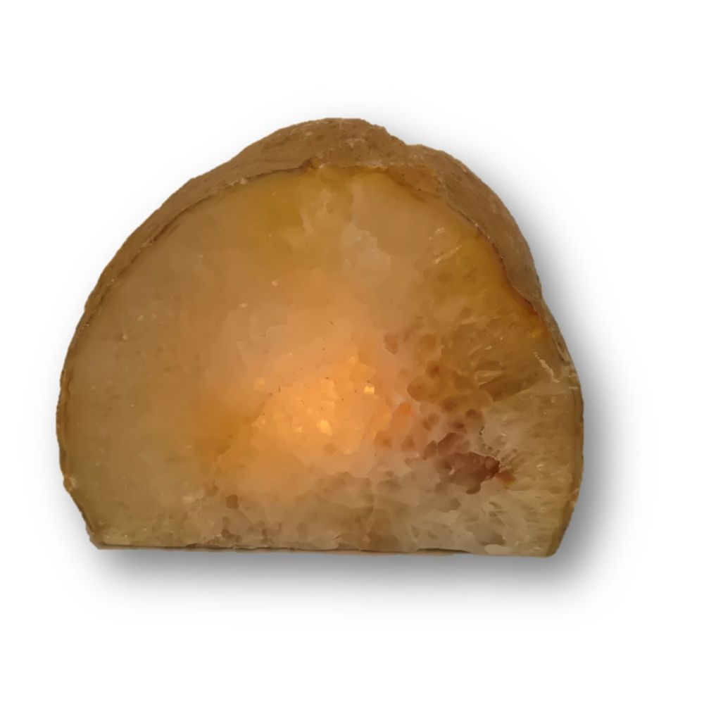 Achat Edelstein Teelichthalter zur Dekoration, zum beleuchten mit einer Teelicht Kerze. Hier wurde eine Achat Geode aufgesägt, die Front poliert und mit einer Bohrung versehen, in die eine Teelicht Kerze passt. Die Bohrung ist tief und so kann der Achat Stein sehr schön leuchten, auf Terrasse, Balkon, Wohnzimmer.. wo immer Sie möchten.