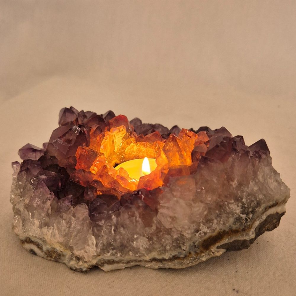 - Natur pur: Gefertigt aus violettem, hochwertigem Amethyst – mit funkelnden Spitzen, die im Kerzenlicht magisch leuchten.