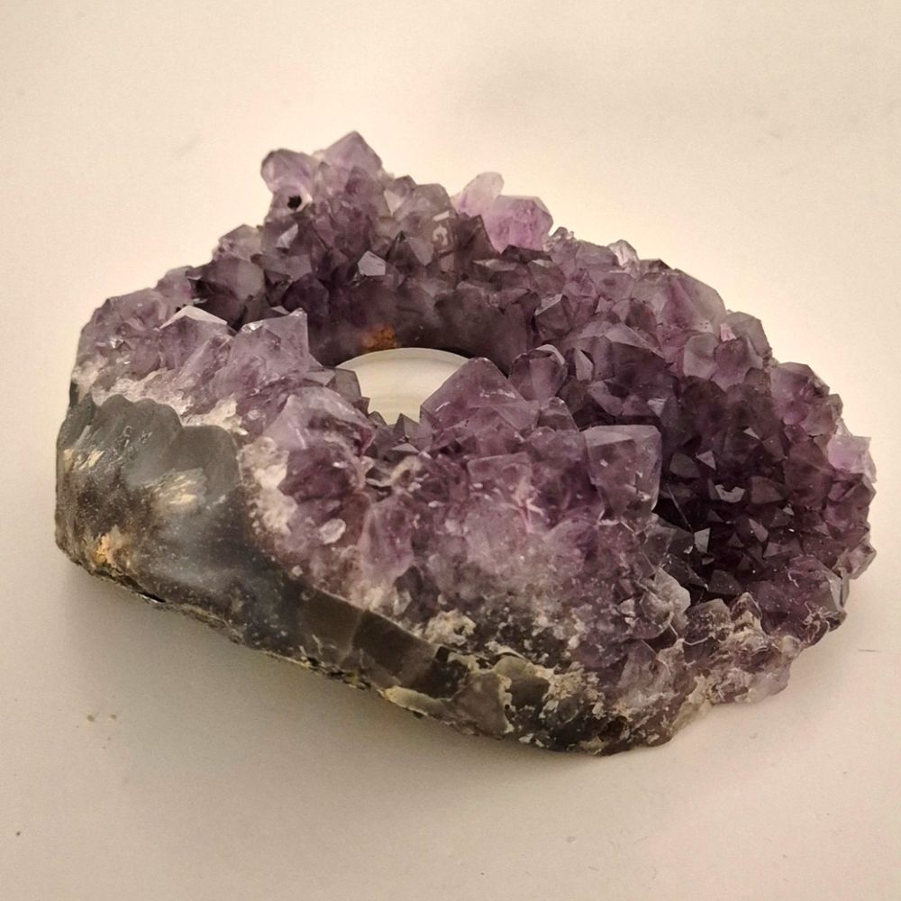 Amethyst Edelstein Teelichthalter, hier ein ausgebohrter Naturstein passend für eine Teelichtkerze. Schöne Amethystspitzen, leuchtet dekorativ, flackerndes Kerzenlicht in Kombination mit einem violetten Edelstein. Jedes Stück ein Unikat, Lieferung Original vom Foto. Ausgestattet mit einem Möbelschutz, zur Entspannung und Dekoration, als besondere Geschenkidee.