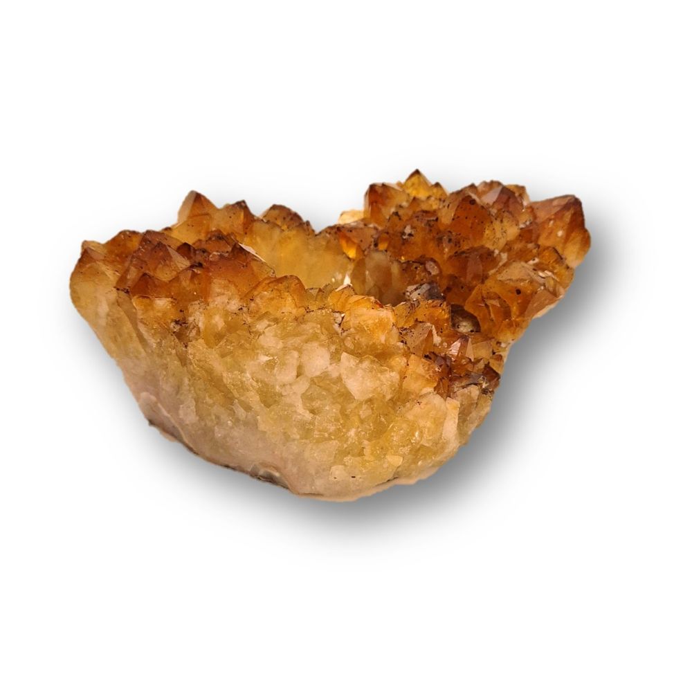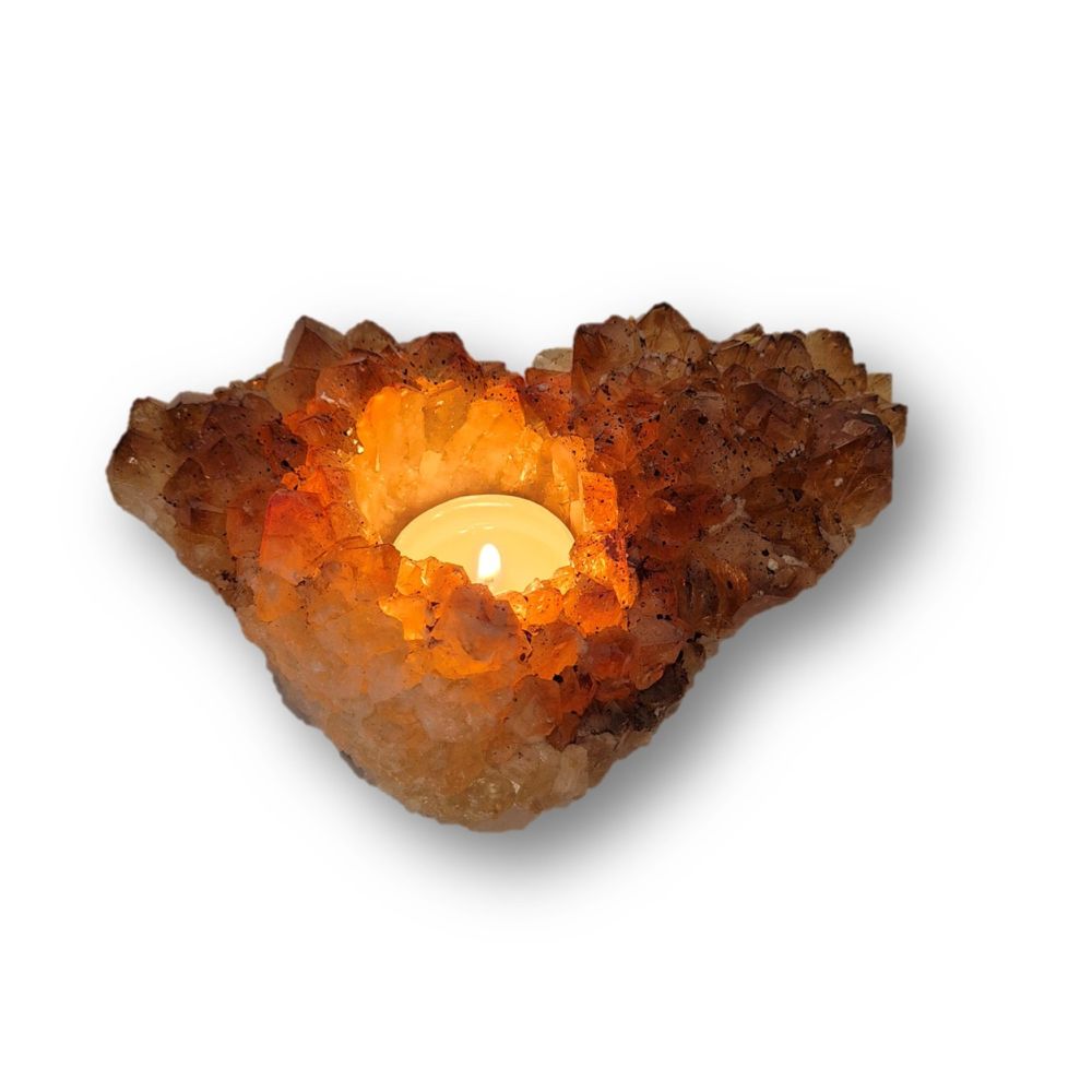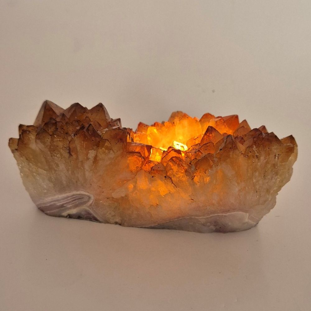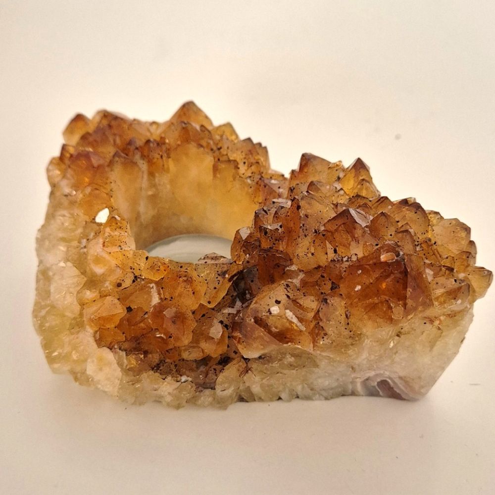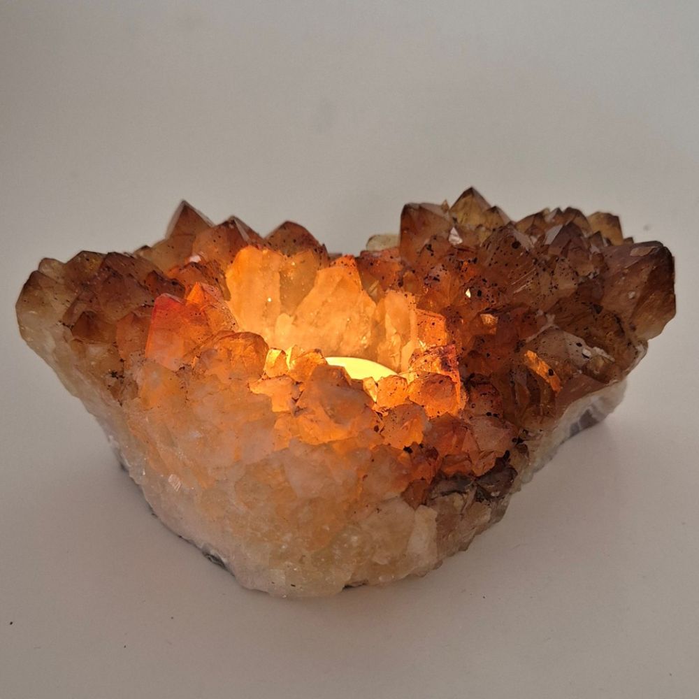 Verwandle dein Zuhause in eine stimmungsvolle Wohlfühloase mit diesem einzigartigen Teelichthalter aus gebranntem Citrin. Jeder Halter ist ein Unikat – sorgfältig ausgewählt und genau so geliefert wie auf dem Originalfoto.