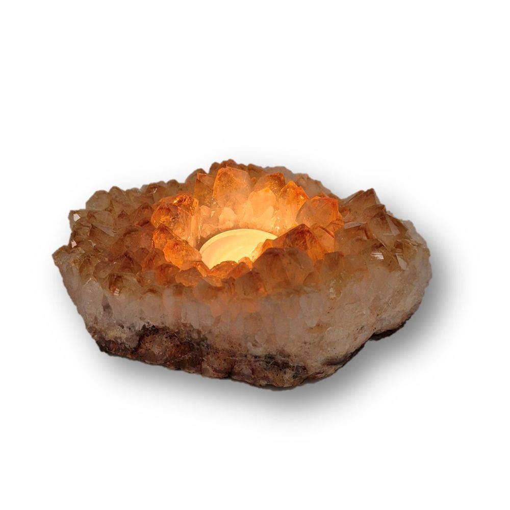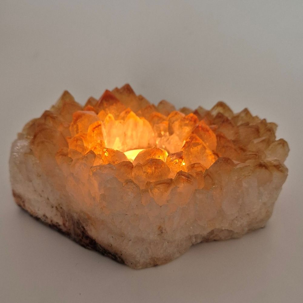 Edelstein-Teelichthalter aus gebranntem Citrin Stein, natürliche, urige Form, flackernder Kerzenschein