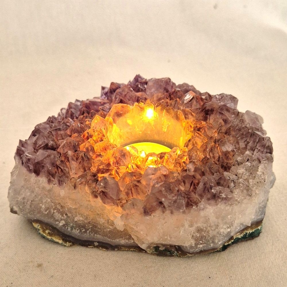 Amethyst Edelstein Teelichthalter, hier ein ausgebohrter Naturstein passend für eine Teelichtkerze. Schöne Amethystspitzen, leuchtet dekorativ, flackerndes Kerzenlicht in Kombination mit einem violetten Edelstein. Jedes Stück ein Unikat, Lieferung Original vom Foto. Ausgestattet mit einem Möbelschutz, zur Entspannung und Dekoration, als besondere Geschenkidee.