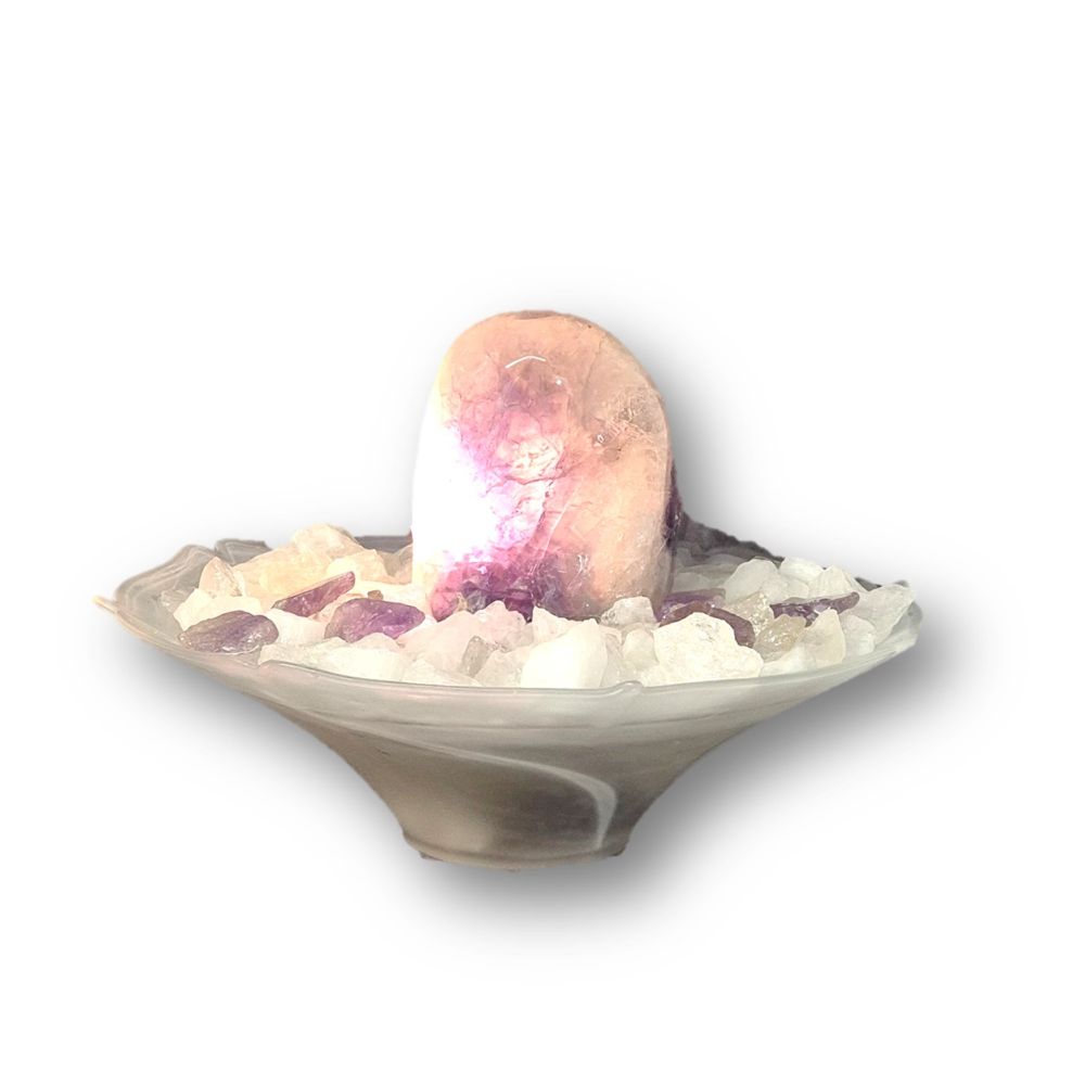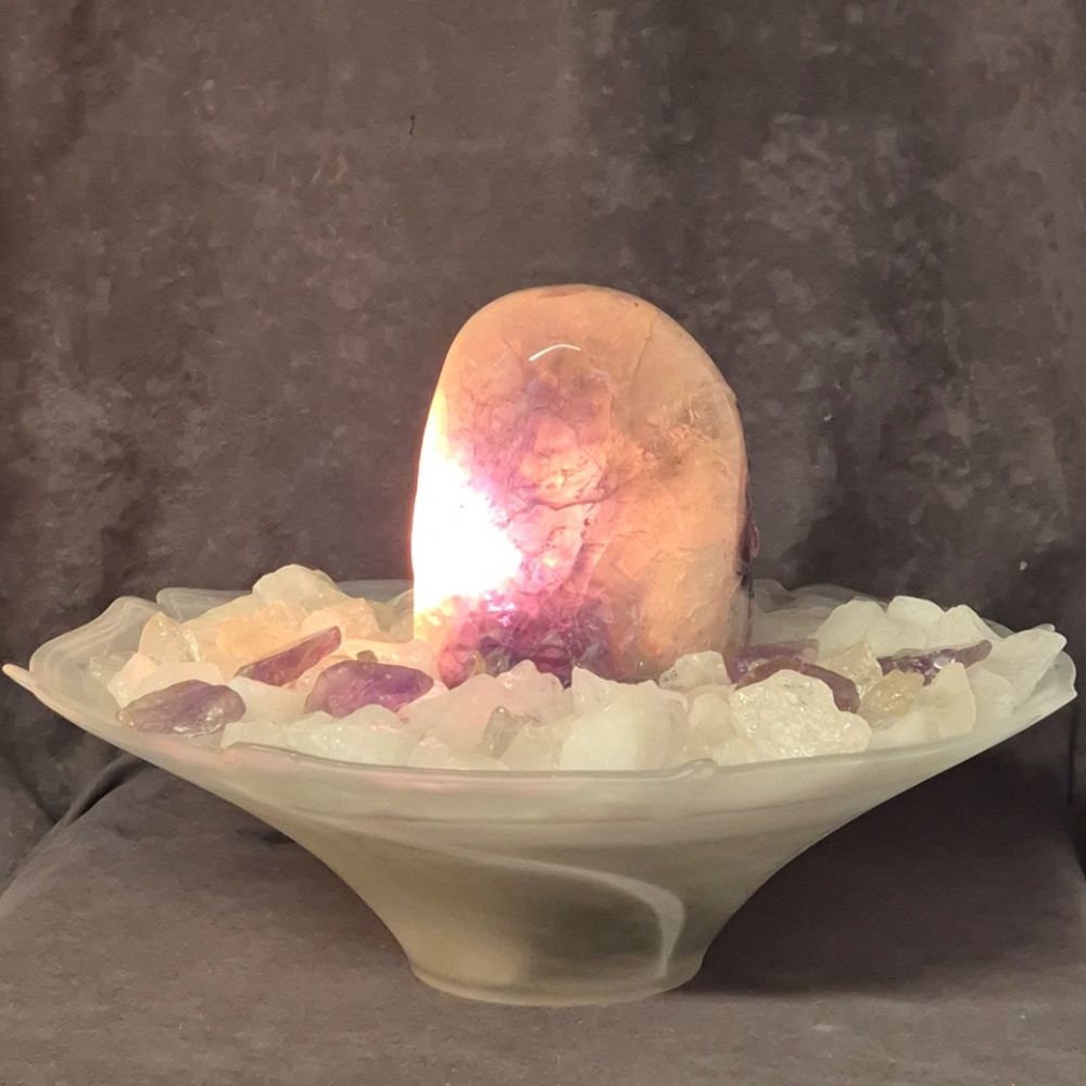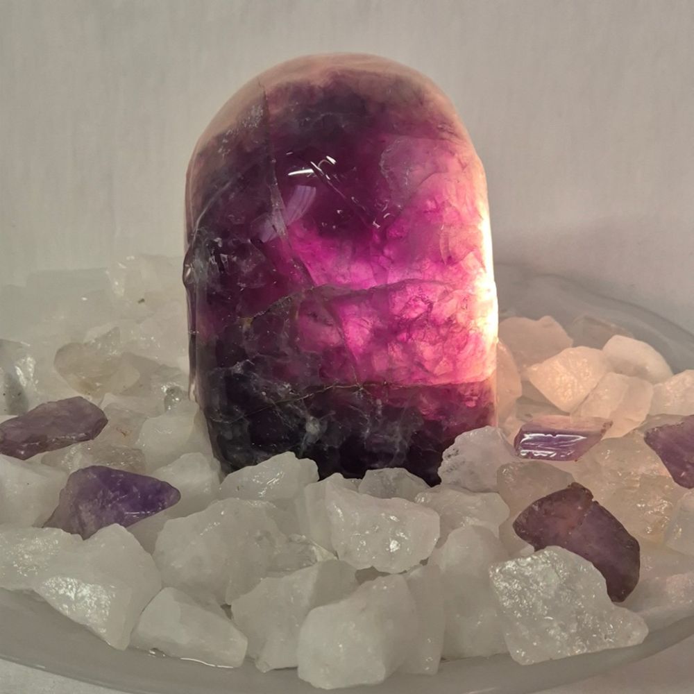 Wunderschöner, hochwertiger Zimmerbrunnen mit echtem Regenbogen-Fluorit Quellstein – ein ganz besonderes Dekorationsstück für Wohnraum, Praxis, Meditationsraum oder als außergewöhnliches Geschenk.